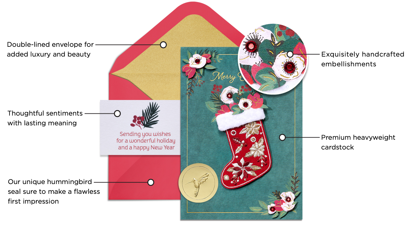 Merry memories are made in the details, and that’s what the tradition of sharing paper cards is all about. Artfully designed and handmade by talented artists, each card is decorated with the finest materials, from sculpted paper to luxurious fabrics, beads, and gems. These enchanting cards make every joyful moment a memory to cherish.
